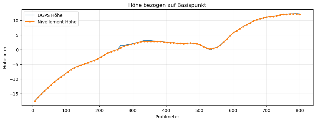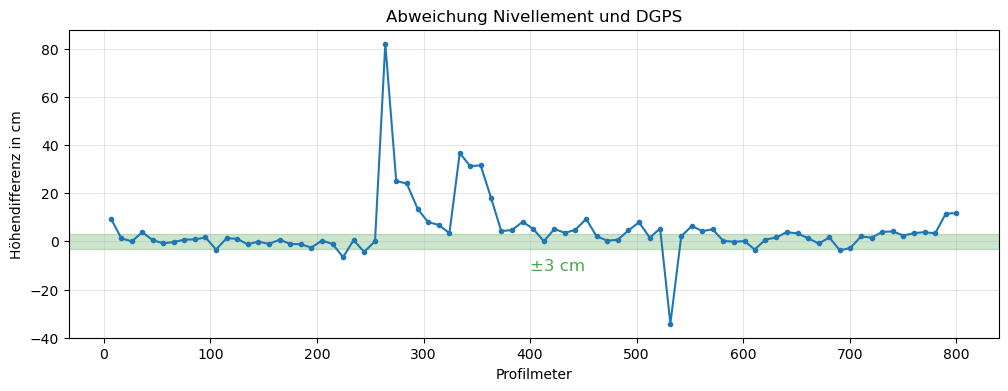 Die Abbildung zeigt den Vergleich der Höhenmessungen mittels Nivellement und DGPS auf identischen Punkten eines Gravimetrieprofils im Zellwald. Das im unteren Bild markierte Intervall von \(\pm\ 3\) cm zeigt, dass nur ein Teil der DGPS-Höhen den Genauigkeitsanforderungen von \(\Delta (\delta g_{F}) \le\) 0.01 mGal genügt.