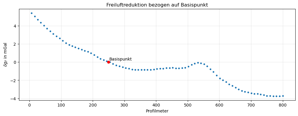 Die Freiluftreduktion beträgt \[ \delta g_{F} = -0.3086 \, h \text{ mGal}, \tag{5.3}\]