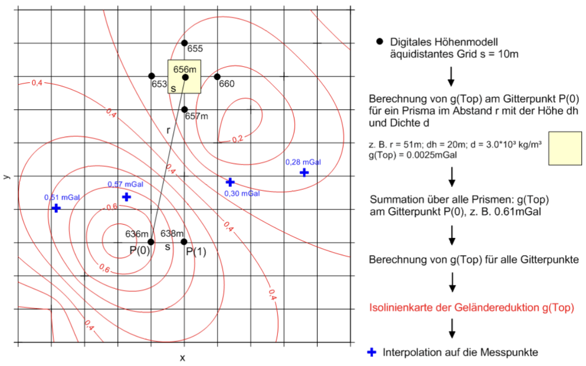 Bei starker Topographie ist eine weitere Reduktion erforderlich. Die Geländereduktion hat zum Ziel, den Einfluss von Geländeunebenheiten zu beseitigen, welcher von der Bouguerreduktion nicht erfasst wird.