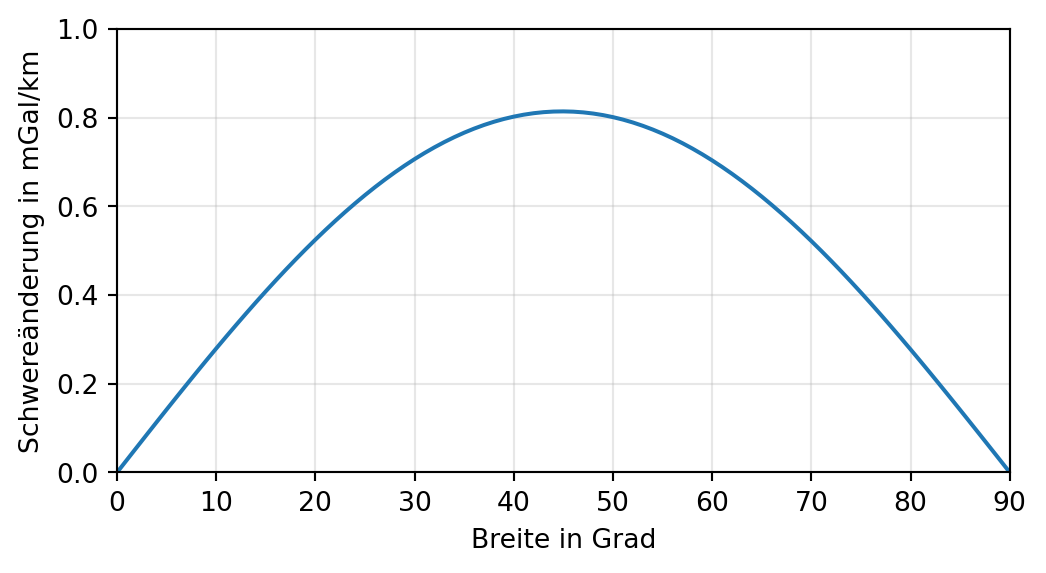 Andererseits erkennen wir an der Abbildung, dass sich bei Bewegung des Messpunktes um 1 km nach Norden die Normalschwere in mittleren Breiten um 0.8 mGal erhöht.
